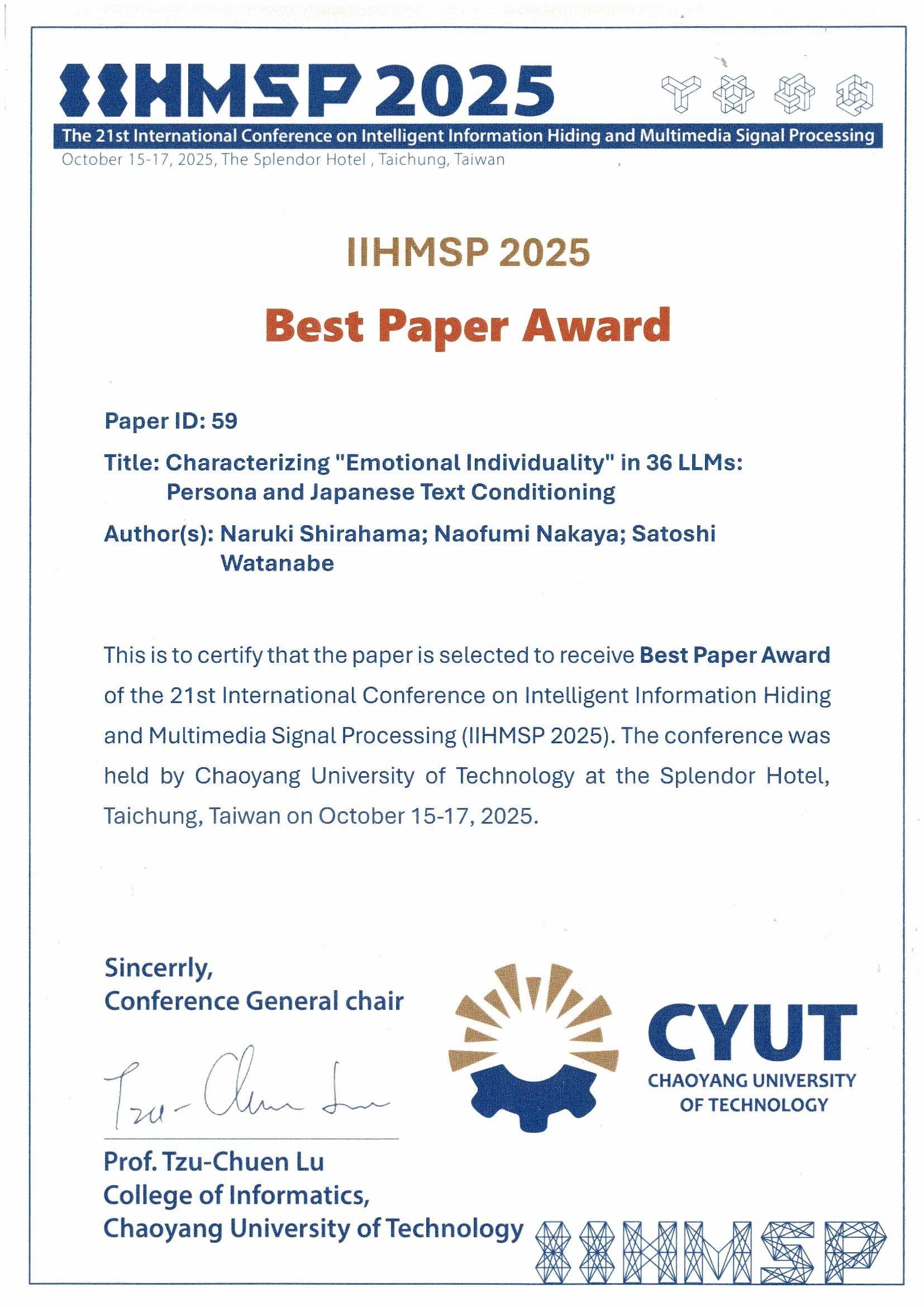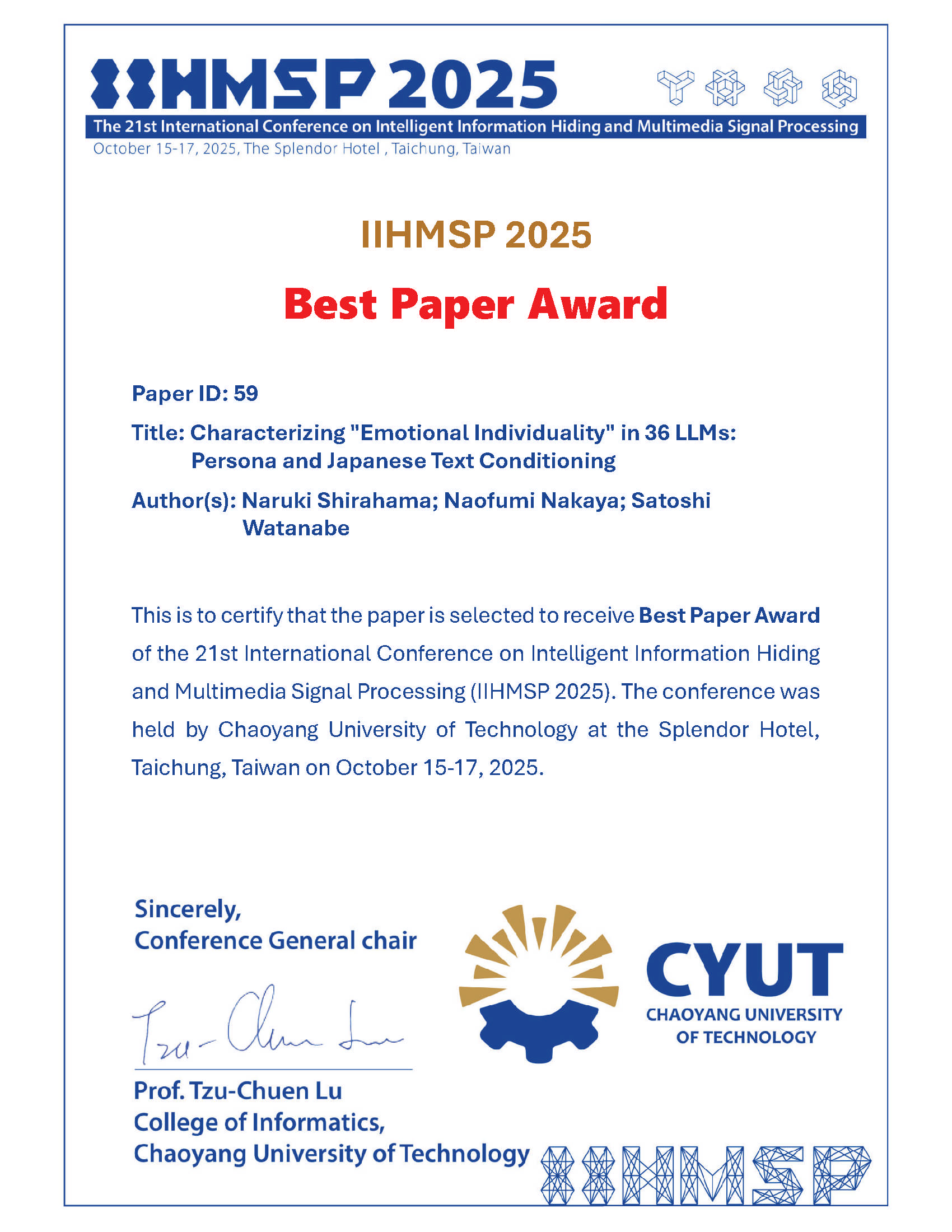 この受賞は、世界をリードする7社36種類のAIモデルの「感情理解の個性」を大規模かつ統一的な手法で科学的に解明した画期的な研究が高く評価されたものです。なお、本研究は特別セッション「AI-Enhanced QoL, Economics, Affective Computing and Modern Technology」(オーガナイザー:渡邉教授・白濵成希教授(下関市立大学))における発表であり、会議全体の採択率約60%(投稿143件中86件採択)の中から、特別セッション内の最優秀論文として選出されました。