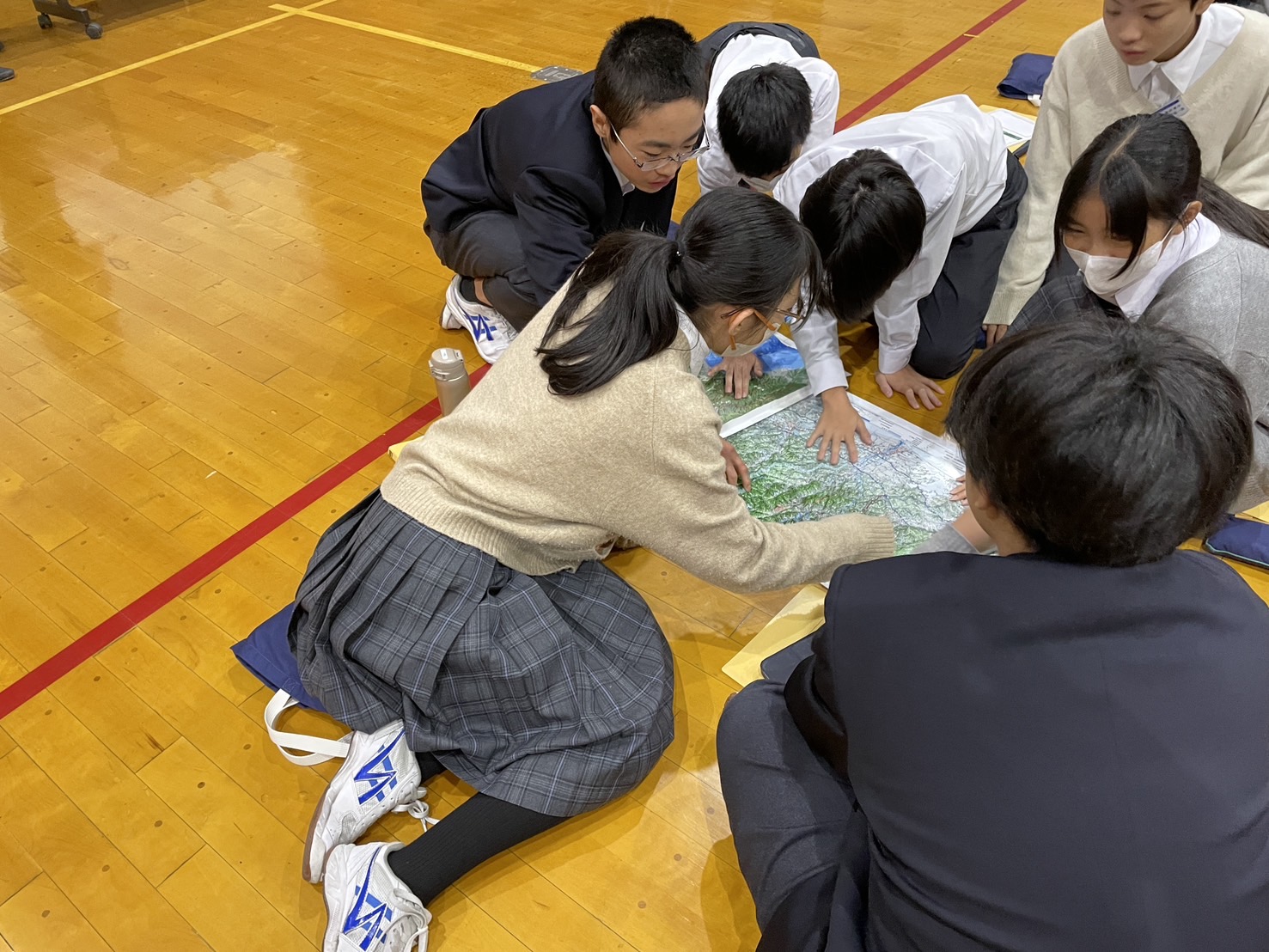 講演会では、研究室が独自に開発した、東中学校周辺の実際の水害リスクをスゴロクゲーム化したFEG(Flood Evacuation Game)を実施し、生徒の皆さんに水害避難時のリスクについて考えてもらいました。本年度3校目の実施であり、次年度以降も継続して、数年かけて掛川市内の全中学校を対象とした同様の企画を実施する予定です。