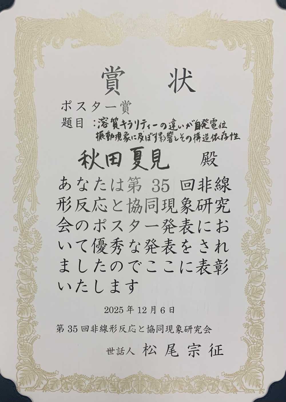 2025年12月6日に広島大学東広島キャンパスで開催された第35回非線形反応および協同現象研究会において、本学大学院理工学研究科材料科学専攻の秋田 夏見さん(非平衡界面化学研究室)が以下のポスター発表を行い、ポスター賞を受賞しました。