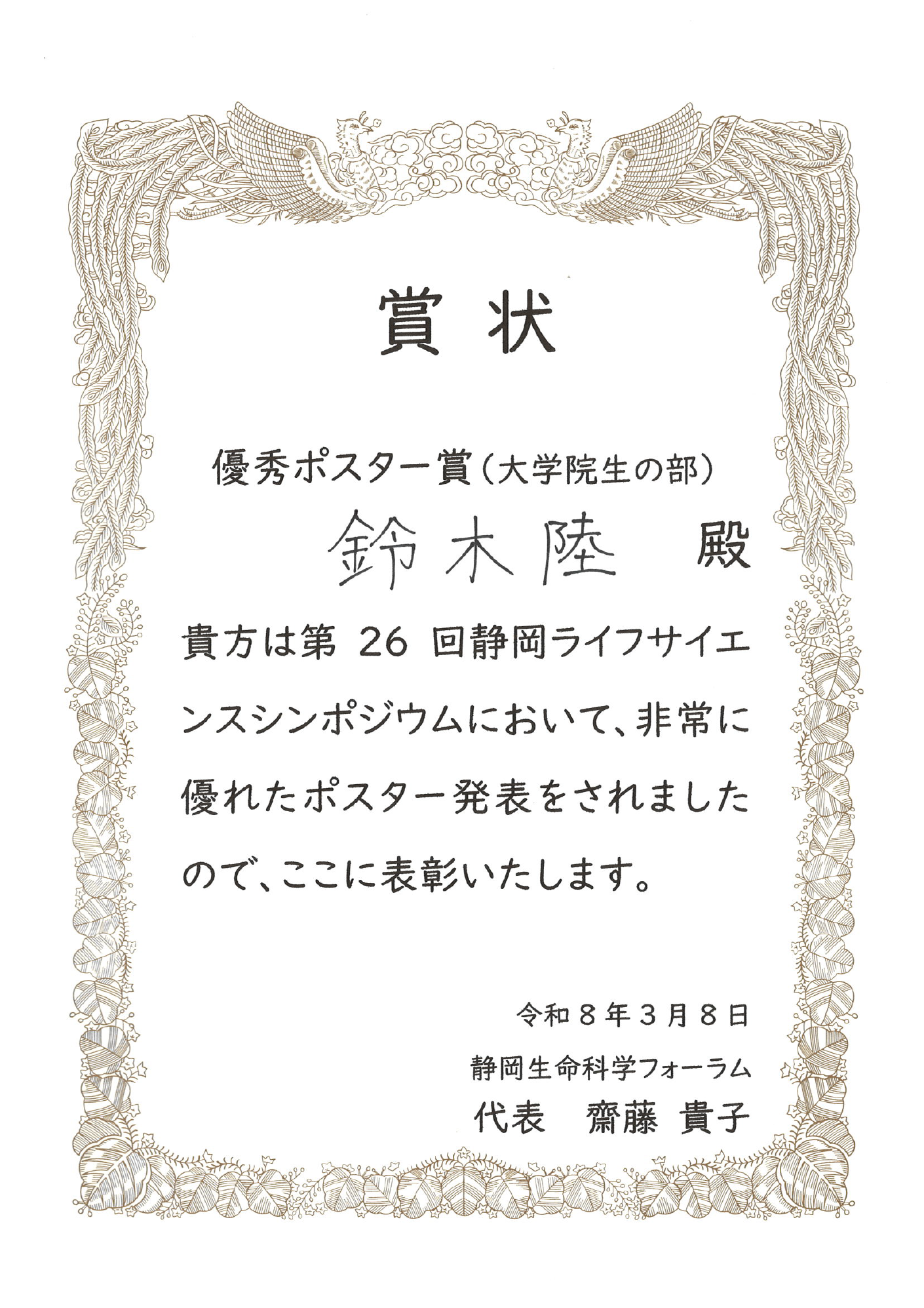 大学院 材料科学専攻の鈴木 陸さんが、第26回静岡ライフサイエンスシンポジウムで優秀ポスター賞を受賞しました