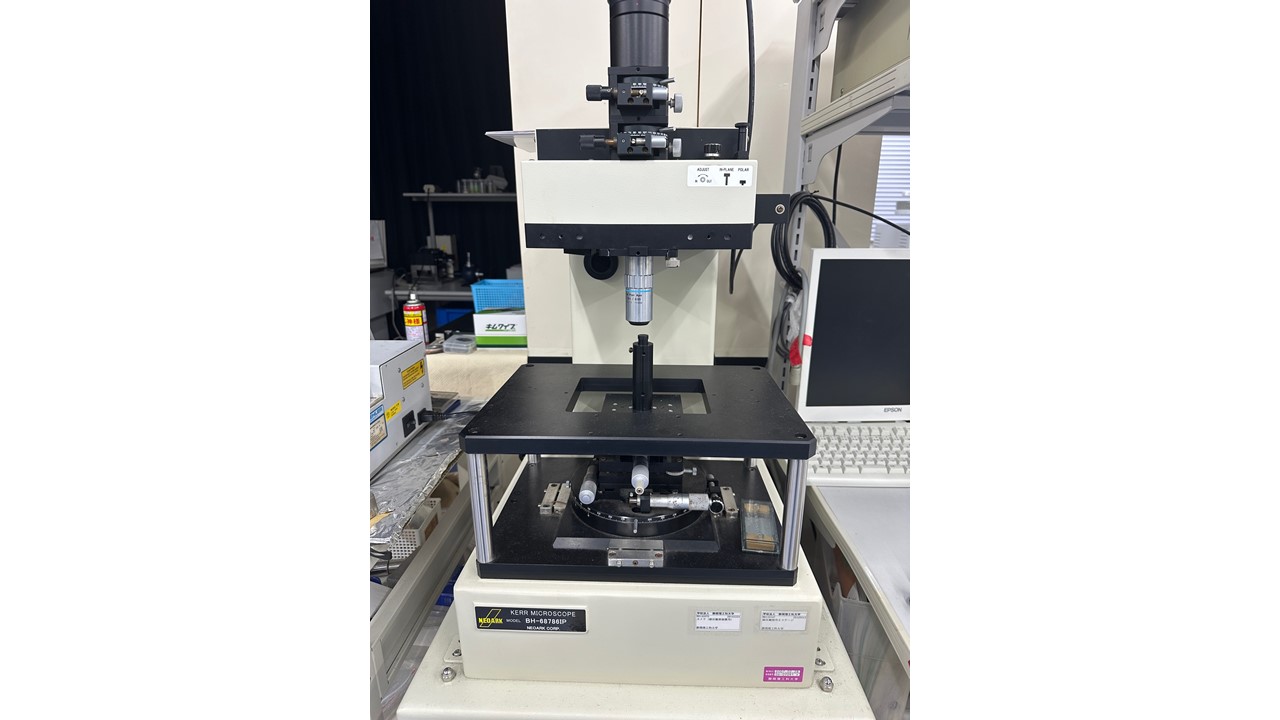 Karr効果顕微鏡 仕様 型名 BH-68786IP (Neoark) 光源 100 W 超高圧水銀灯 結像光学系 面内磁化観察光学系 垂直磁化観察光学系 倍率 低倍率:×2 高倍率:×20、×50 カメラ 高感度・高解像度モノクロCCDカメラ 観察サイズ 約0.1 mm、約0.25 mm